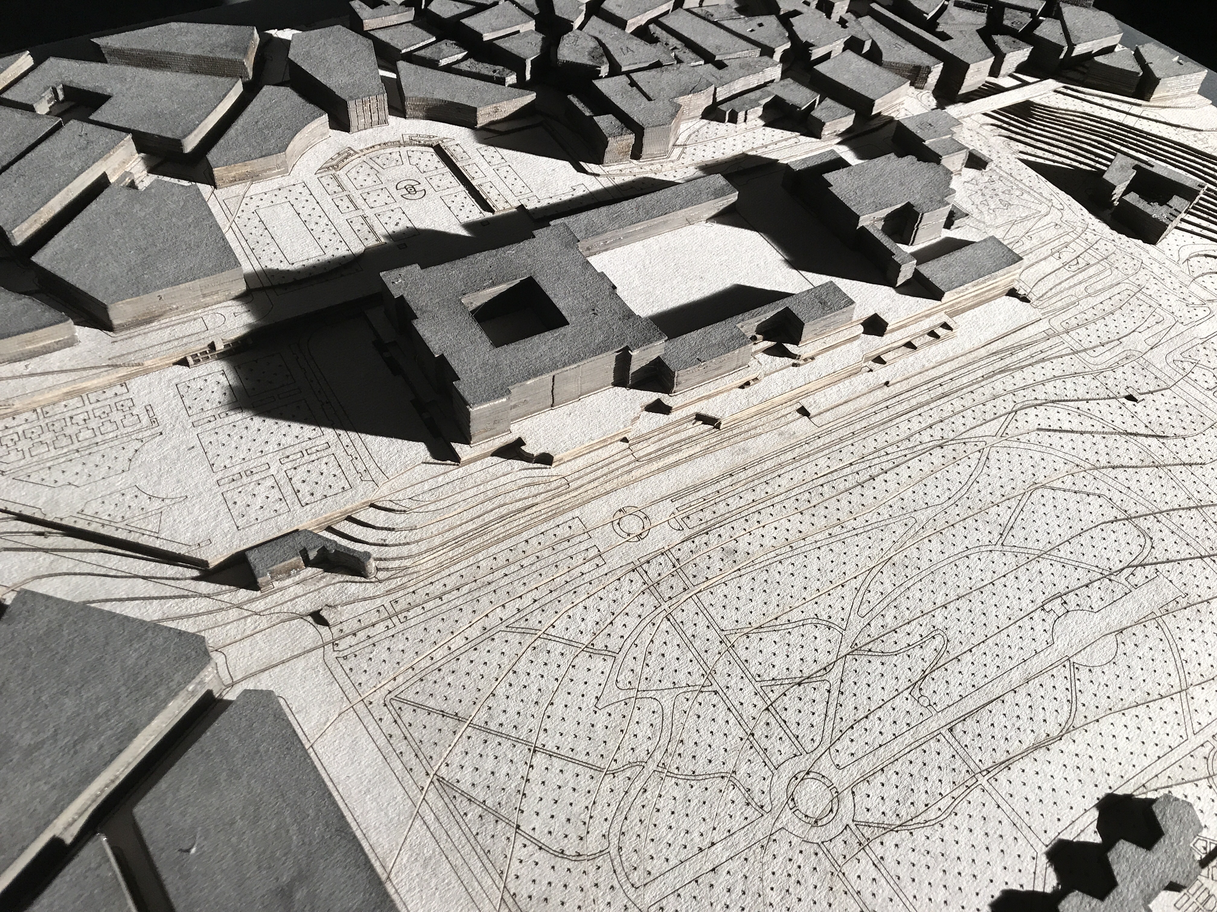 Drawing inspiration from how Plaza Mayor imposes itself onto the fabric of the medieval core of Madrid, I wanted to explore further how the architectural promenade would affect the western edge of the city. I decided on 1:2000 as it showed a good contrast between the density of the medieval city to the east and the less urbanised area around the Campo Del Moro Gardens. The topography of the land dictates the layout of the streets in this part of the city; with the Palacio Real sitting atop a 40 metre high series of terraces and the surrounding streets following the contours of the land.